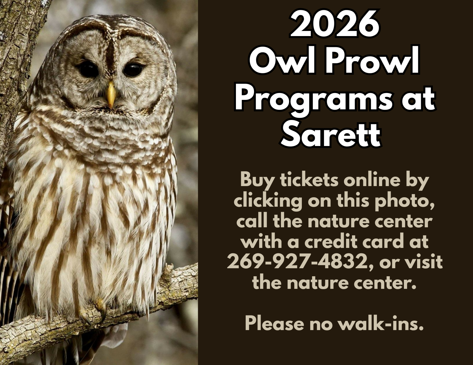 The Owl Prowl on February 13 is completely full. If you would like to be placed on the waitlist please contact us as sarett@sarett.org or call 269-927-4832 x 101.