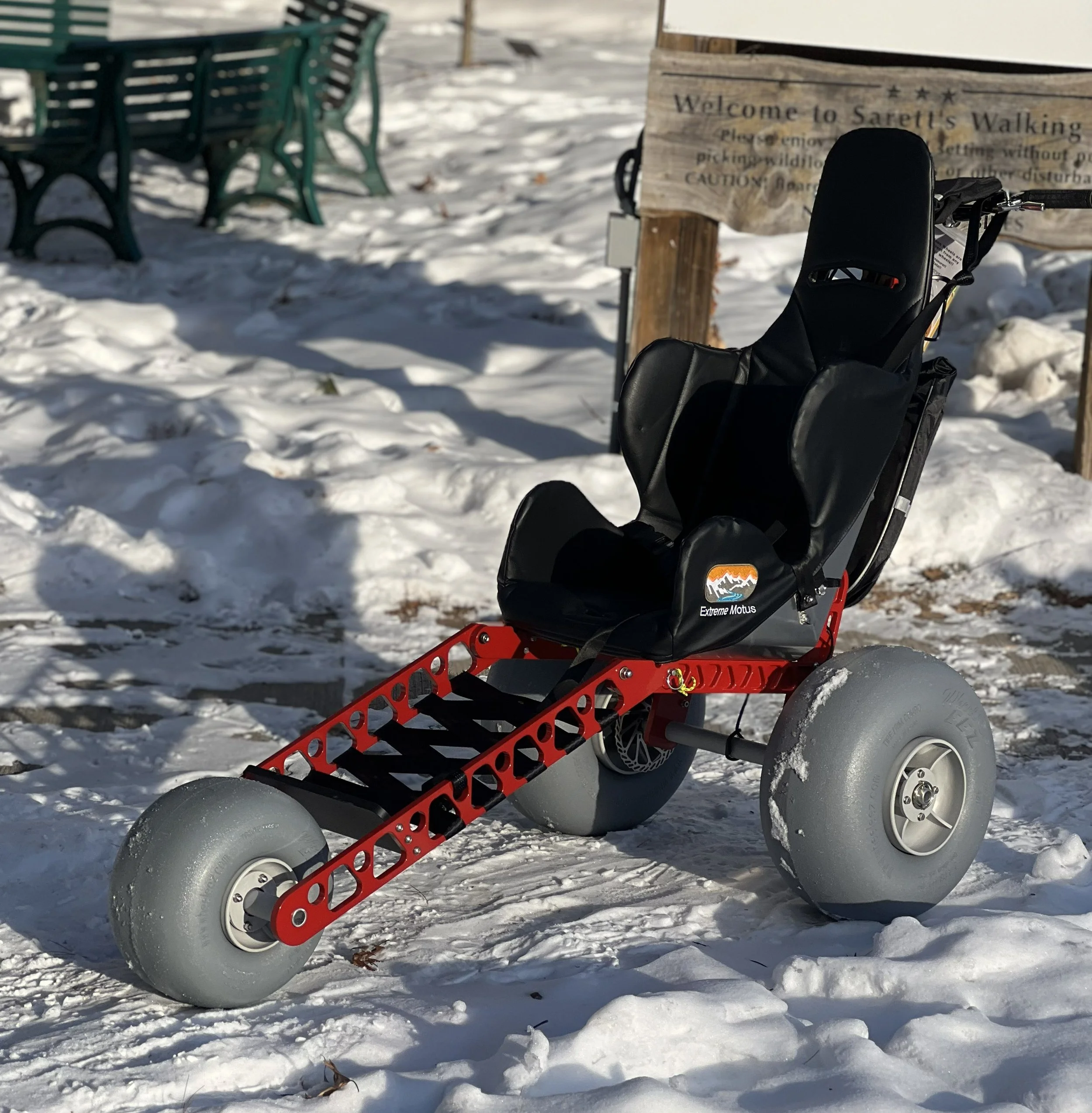 This all terrain wheelchair is designed for children and small adults under 90 lbs. It has balloon-tires that can handle snow, mud, roots, and more! It provides access to over 4 miles of Sarett's trail system (no boardwalks please). It is not self-propelled and requires someone to push the chair. It has hand brakes and a tether to ensure control and safety on hills.